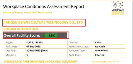 在驗廠之家老師專業技術、全程一對一跟進耐心細致輔導以及公司全體員工配合下,一次性順利通過ITS-WCA驗廠,為將來公司發展奠定了良好的發展基礎,既開拓了市場同時也增加了消費者對公司的信賴,在這里再次祝賀江蘇百威文化科技有限公司2023年一次性成功通過ITS-WCA驗廠,同時也期待未來再次與驗廠之家合作!