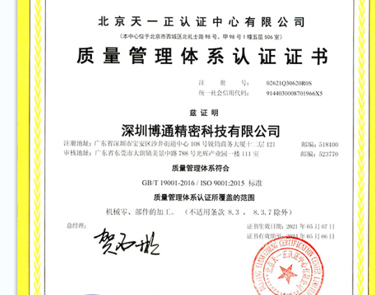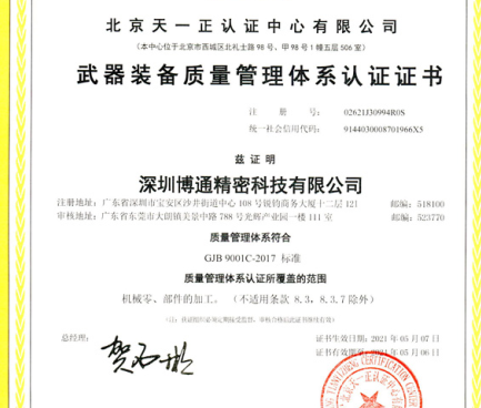 祝賀深圳博通精密科技有限公司通過GJB 9001C、ISO9001兩項(xiàng)質(zhì)量管理體系認(rèn)證
