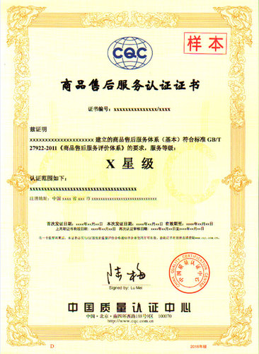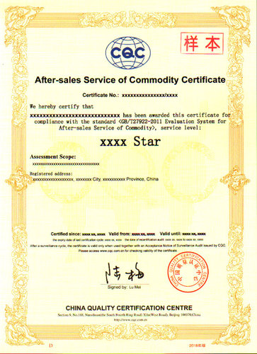 售后服務認證證書(GB-T27922)中文版樣本