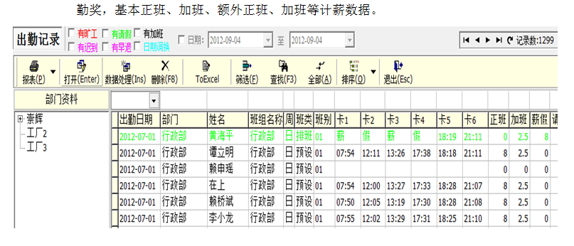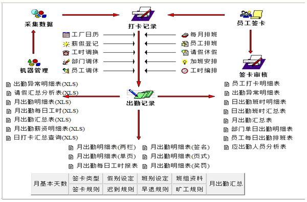 系統(tǒng)會(huì)按排班規(guī)則計(jì)算出勤記錄資料,按相應(yīng)的班別條件計(jì)算出正班、加班、曠工、遲到、早退、遲到早退的次數(shù)、請(qǐng)假時(shí)間、薪假時(shí)間、班別津貼、休息時(shí)間等詳細(xì)數(shù)據(jù)。