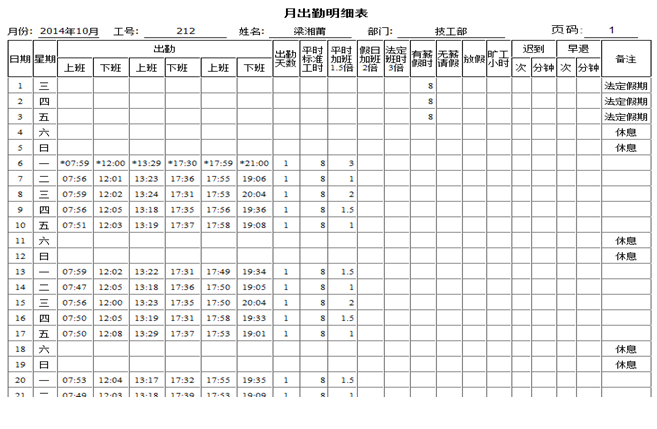 考勤管理-月出勤明細(xì)表(欄式)
